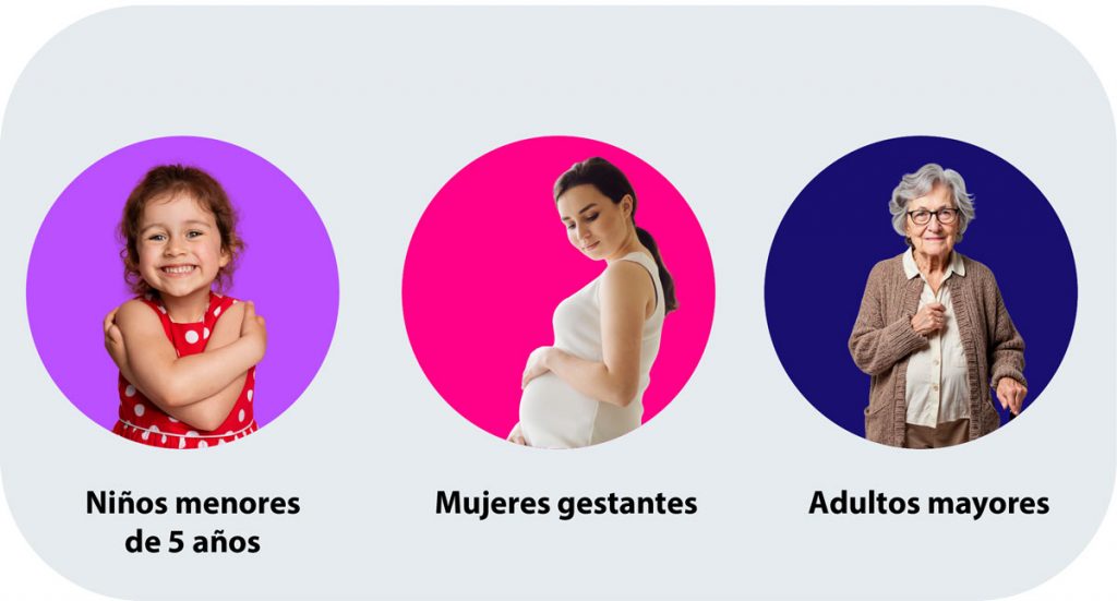 Otros grupos de alto riesgo incluyen embarazadas, personas con inmunosupresión, enfermedad pulmonar o cardiaca crónica, diabetes y obesidad. En la región de las Américas, la OPS llama a priorizar la vacunación, vigilancia y preparación de servicios para estos grupos en periodos de alta circulación (por ejemplo, SARS-CoV-2, influenza y VRS en la misma temporada).