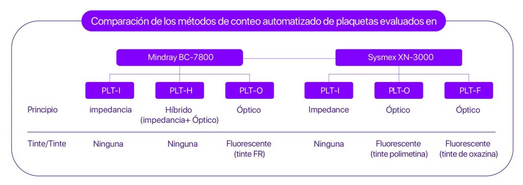 Este estudio comparó múltiples métodos de conteo de plaquetas en analizadores de última tecnología, utilizando citometría de flujo como método de referencia internacional (IRM), en muestras con microcitosis de glóbulos rojos y Leucemia Aguda.