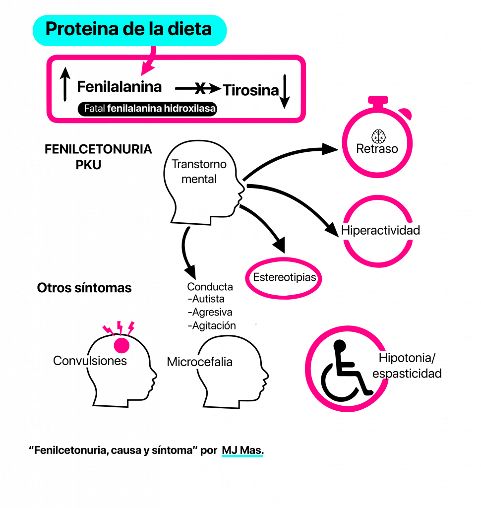 La fenilcetonuria es una enfermedad hereditaria de carácter autosómico recesivo, en donde hay acumulación del aminoácido fenilalanina por defectos en la enzima fenilalanina hidroxilasa que lo sintetiza para convertirlo en Tirosina. Causando un daño cerebral que puede ser significativo o muy grave.